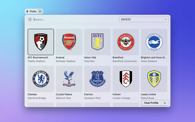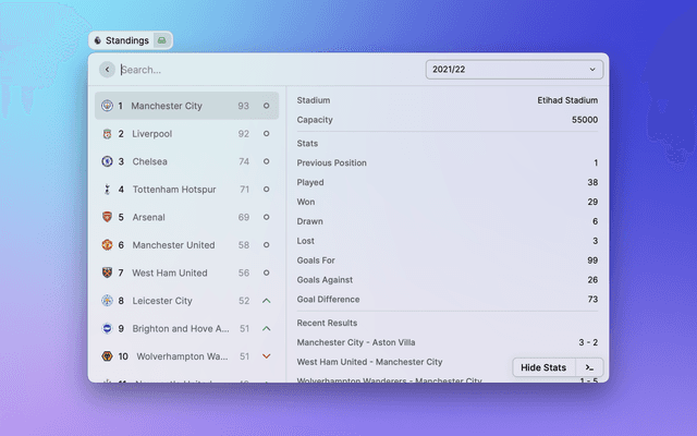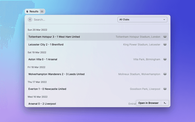 View the latest Premier League tables, form guides and season archives in Raycast.