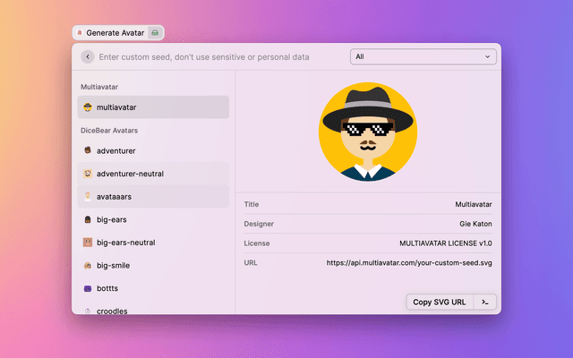 We provide a large number of avatar styles from different designers. The designs are licensed under different licenses that the designers can choose themselves. Some licenses require attribution. For a quick overview we have created a license overview for you.