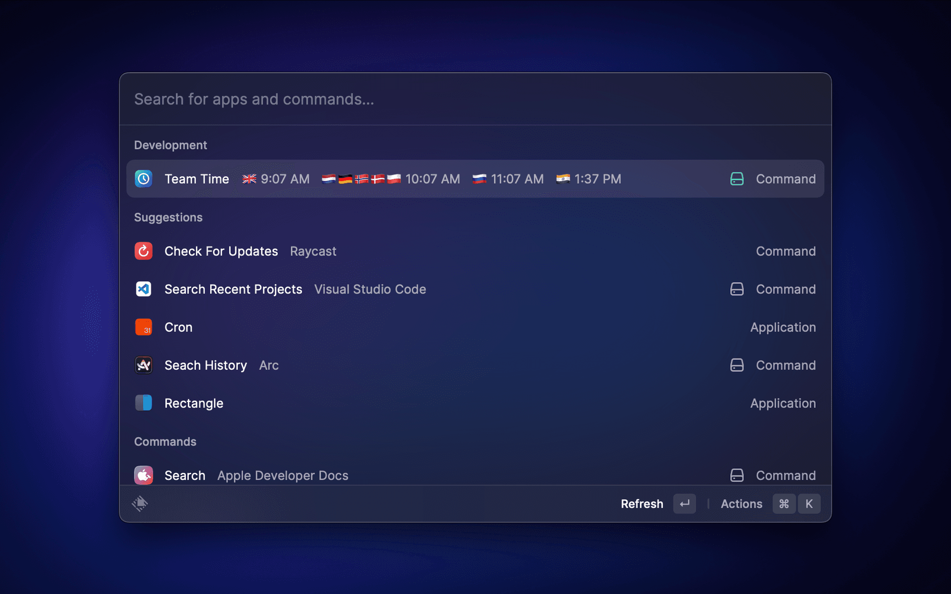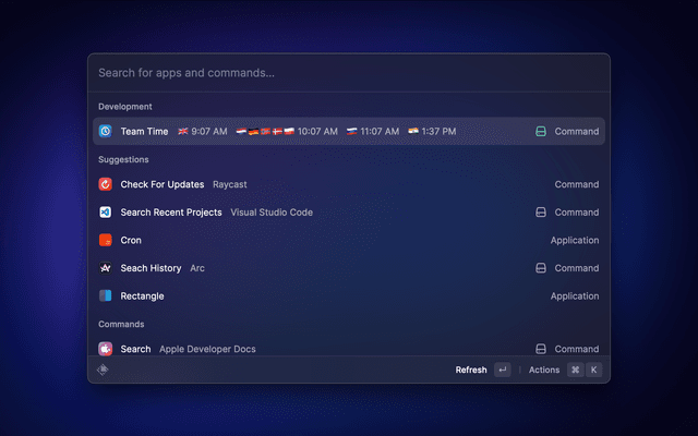 Pro tip: Favorite the command in Raycast. This way, you see your team's time zones whenever you toggle the app.