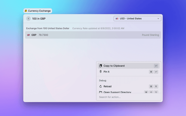 There's a currency exchange function out of box in Raycast's Calculator. You can type like 12 usd in gbp to show the currency exchange result. In some case, when you exactly know the currency code, it works fine, but it still has some challanges: